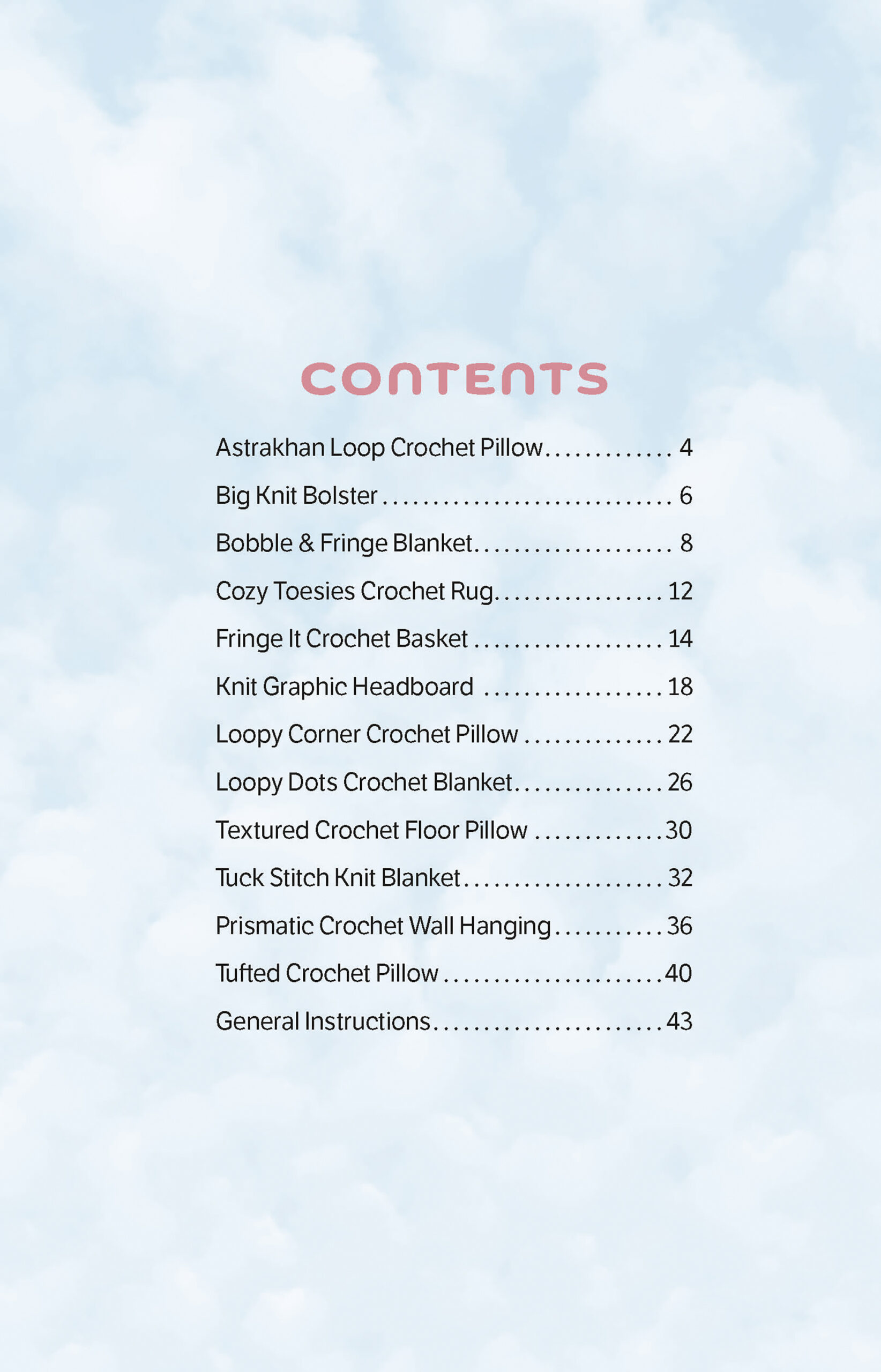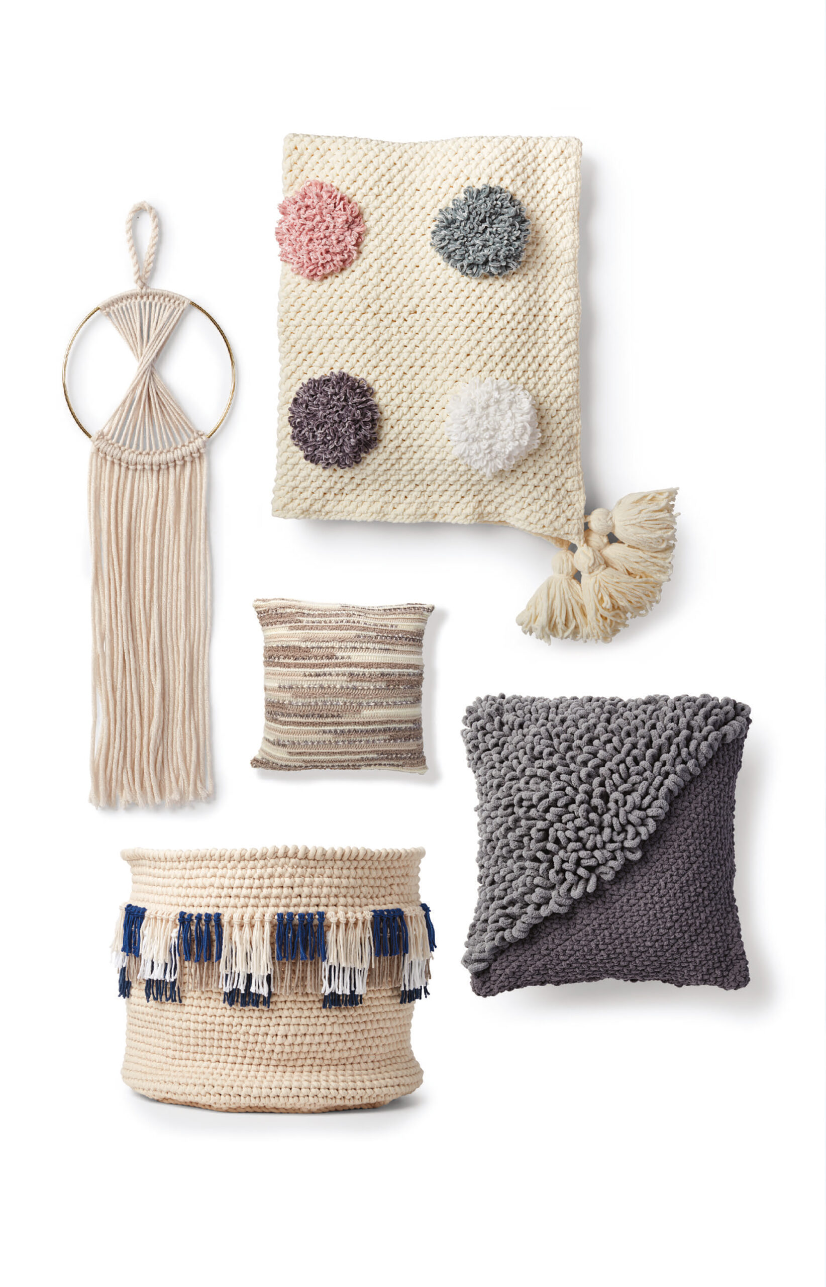 Daydream Pattern Collection Knit & Crochet- Twelve crochet and knit projects are the gateway to your dreams. Spinrite has the yarn for them all. With pillows, blankets, a graphic headboard, easy to make wall hangings, and a fringed basket, the most difficult part will be deciding what to make first. Includes basic to intermediate skill level designs. Quickly work up your own project with size 5 bulky, 6 super bulky, or 7 jumbo yarns. Uses US size 15 or 17 knitting needles and K, L, N, or P crochet hooks. 48 pages in a softcover.