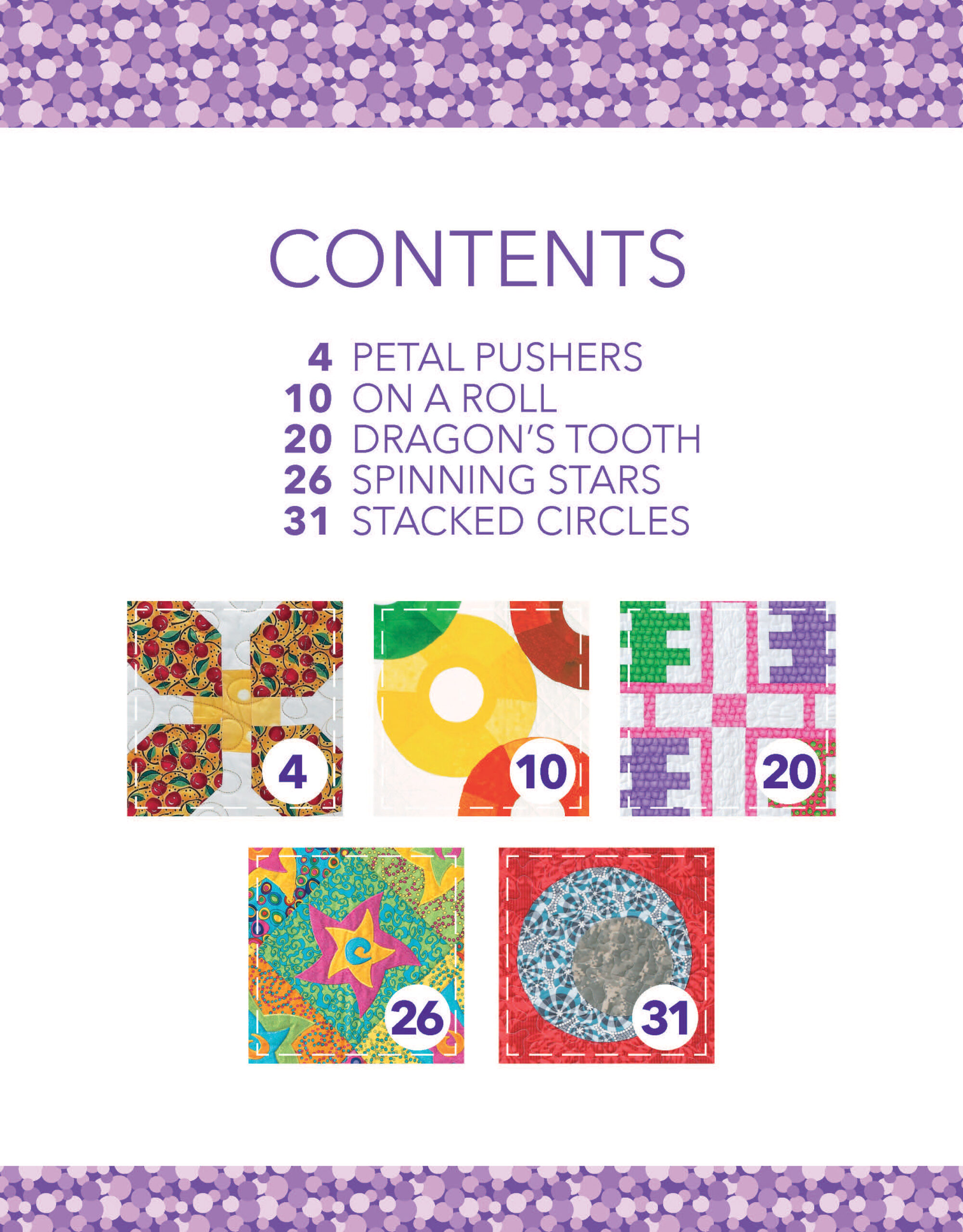 Fun Colorful Quilts- Turn your favorite shapes into eye-catching quilts. Vibrant fabrics in a medley of popular shapes make these quilts fun and colorful. Just chose your color palette and one of the 5 designs and you’ll have a fabulous new quilt for your home or a gift. Designs include: spinning stars, petal pushers, on a roll, dragon’s tooth, and stacked circles. Includes step-by-step instructions, cutting diagrams for each block, and quilt top diagrams to help you through the process of creating each quilt. Finished quilts measure between approximately 47″x 60″ and 73″x 87″. Some designs are fat quarter friendly. Easy to intermediate skill level. 48 pages, softcover.