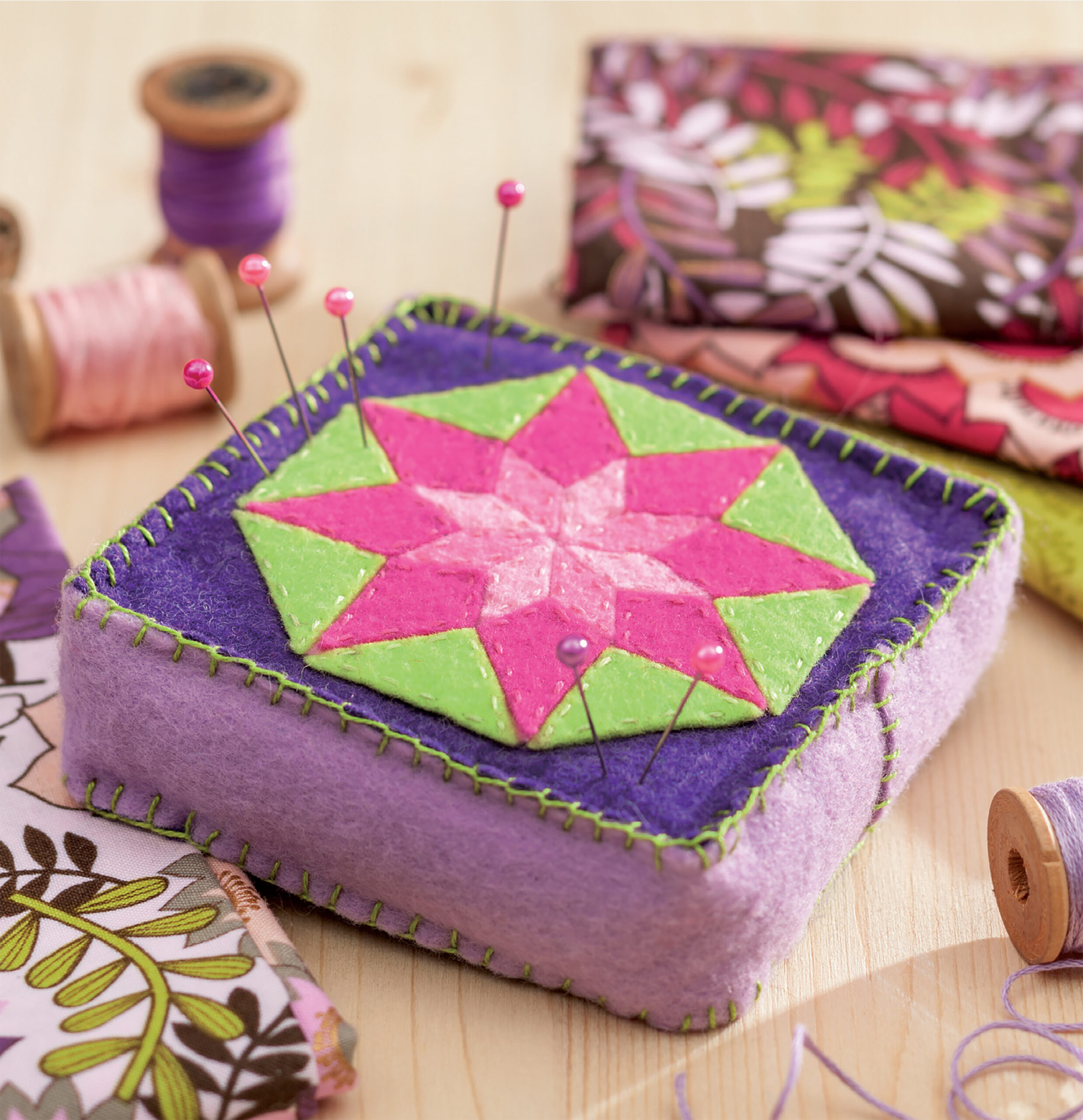 Learn to Create Felt Pincushions- Learn to create with felt by making twelve quilt block inspired pincushions. Designs include: lattice square, friendship star, flying geese, four leaf clover, diamond star, geometrical stars, lily, pole star, western star, mariners compass, bay leaf and sun goddess. Includes a materials list, diagrams, photos, and assembly instructions for each project. General instructions teach you to make the pincushion base with both hand machine sewing techniques. Finished pincushions each measure approximately 4″x 4″. Beginner skill level. 32 pages, softcover.