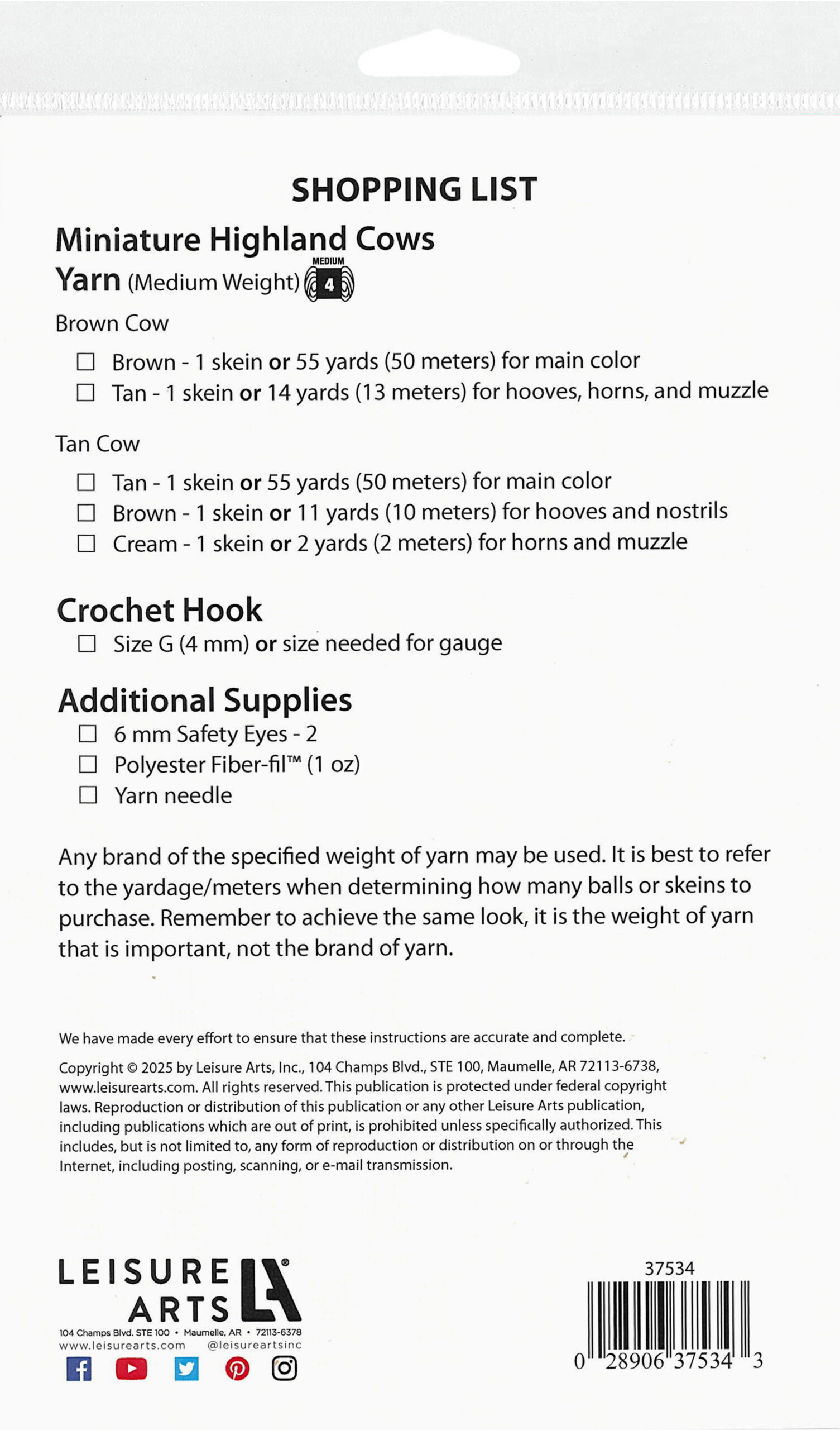 $7.99LEA Amigurumi Miniatures Highland Cows Pattern- Bring this adorable pair of miniature highland cows to life with their signature shaggy coats and tiny horns. Designed for intermediate-level crocheters, our easy-to-follow crochet pattern provides step-by-step instructions and detailed images to guide you through every stitch. Perfect for gifts, home décor, or adding a bit of rustic charm to your amigurumi collection, these lovable cows are sure to steal hearts. The pattern includes a complete list of supplies needed to complete both cows. Finished designs measures approximately 4" length x 4" height.