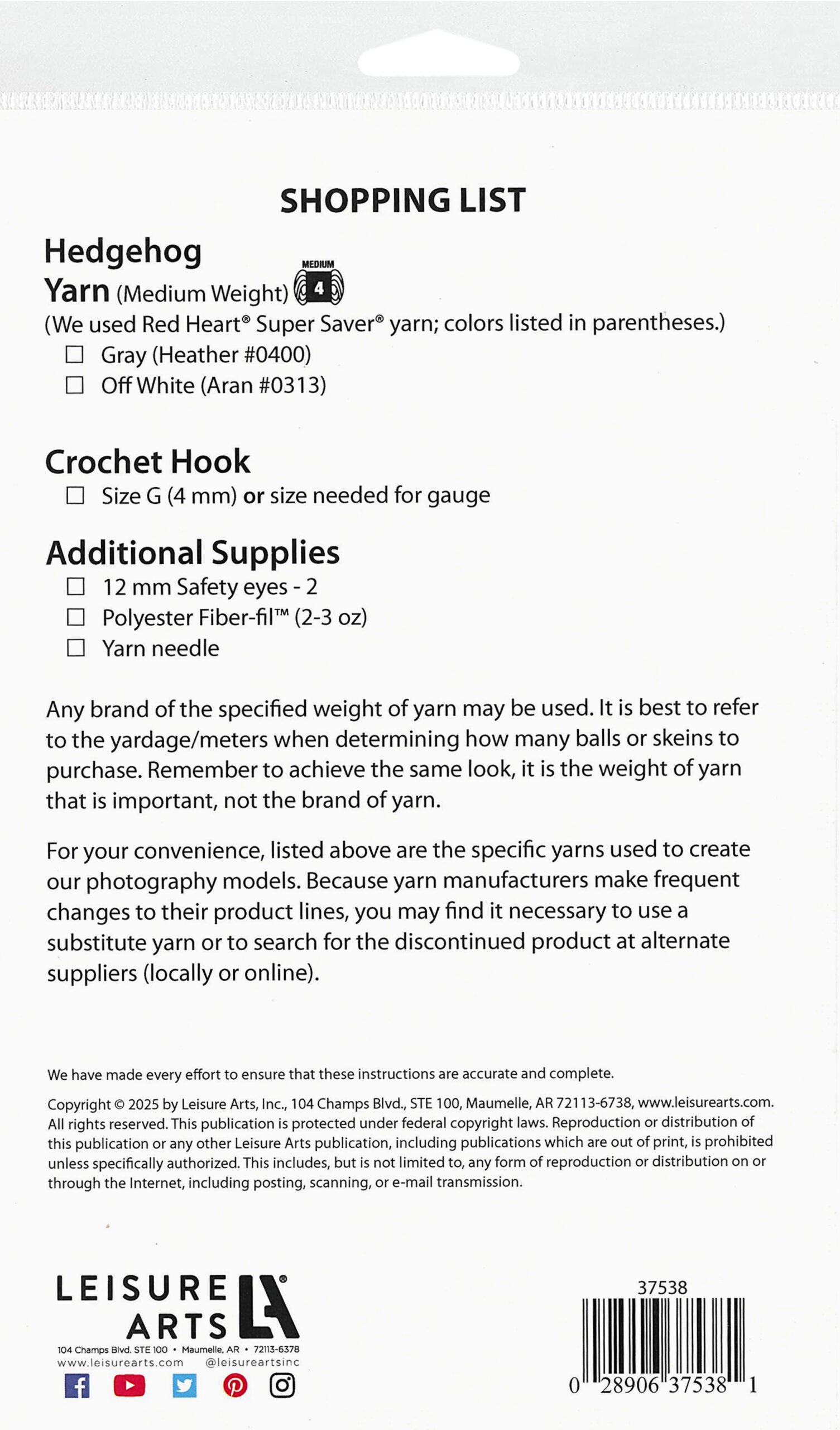 $7.99Leisure Arts Amigurumi Hedgehog Pattern- Ready for a fun crochet challenge? This Amigurumi Hedgehog crochet pattern will help you create a charming hedgehog perfect for crocheters looking to add a special touch to their creations. With detailed instructions, you will craft a soft, cuddly hedgehog with a distinct and delightful design. This pattern includes a color-coded chart, and a list of supplies needed to complete project. Finished design measures approximately 5†length x 8†height.