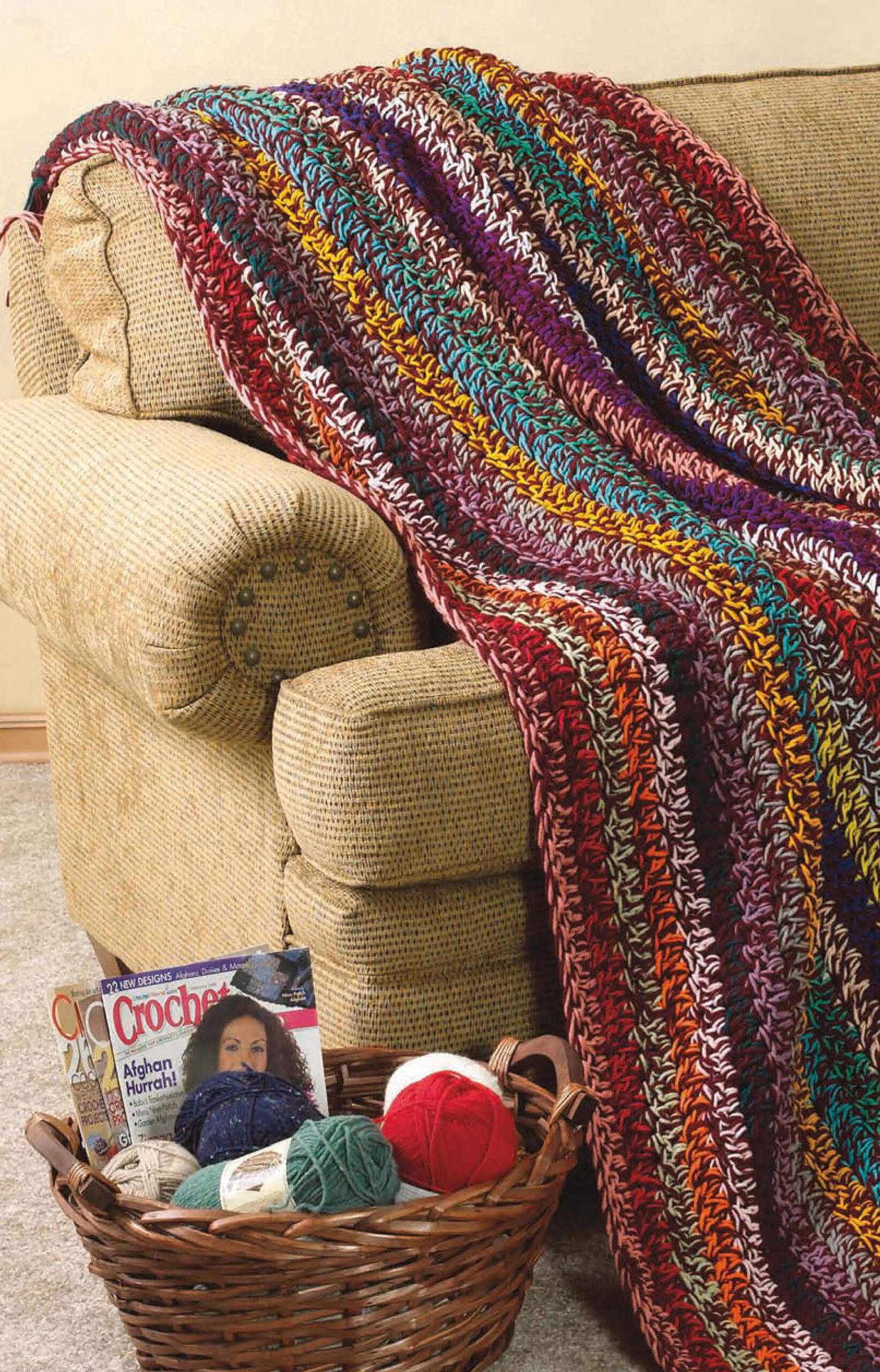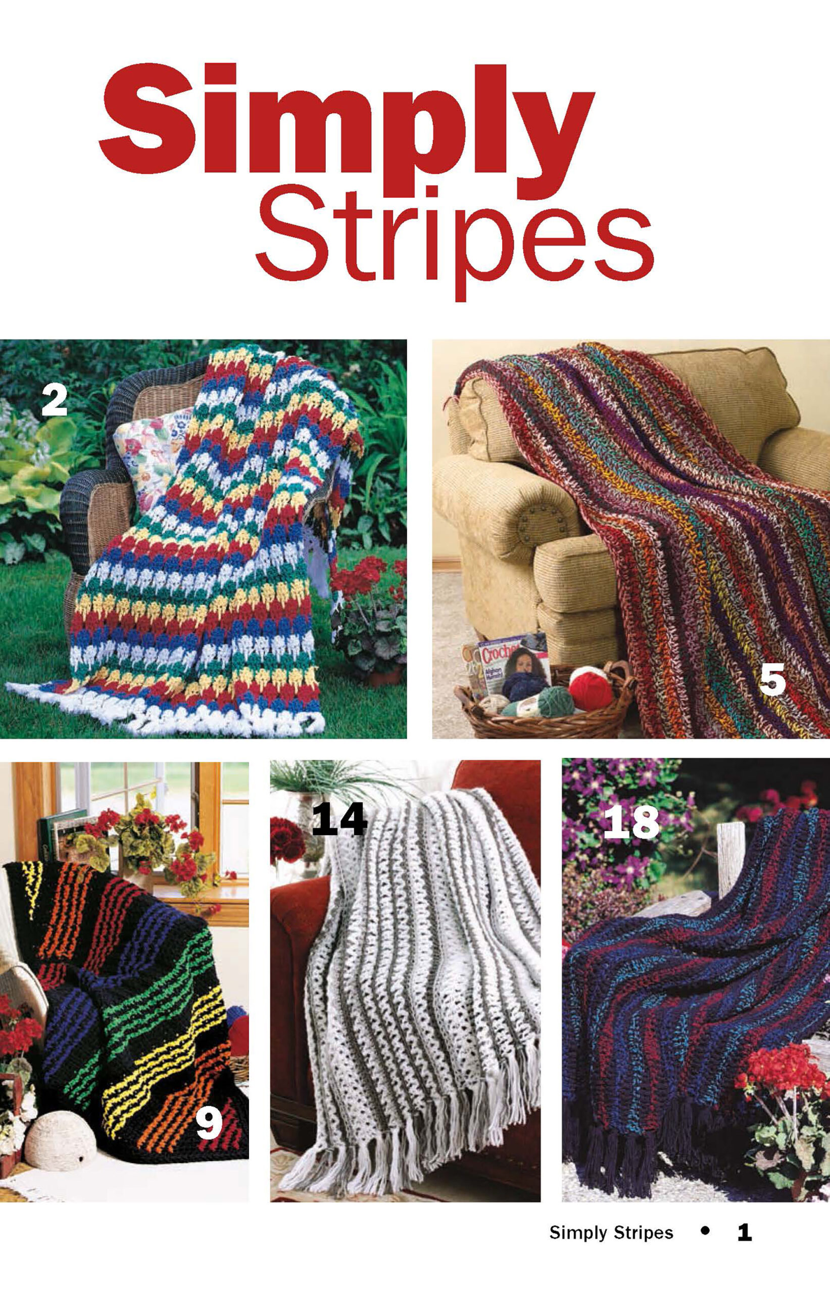 Leisure Arts Crochet Simply Stripes Book- Who knew that stripes could take on so many different looks. The 5 afghans in this collection reflect wavy stripes, mirror-image stripes, lacy stripes, bold diagonal stripes, and textured stripes created with a long double crochet stitch that extends into the row before last. 5 striped afghans to crochet in bulky yarn or with 2 or 3 strands of medium/worsted weight yarn. 24 pages, soft cover.