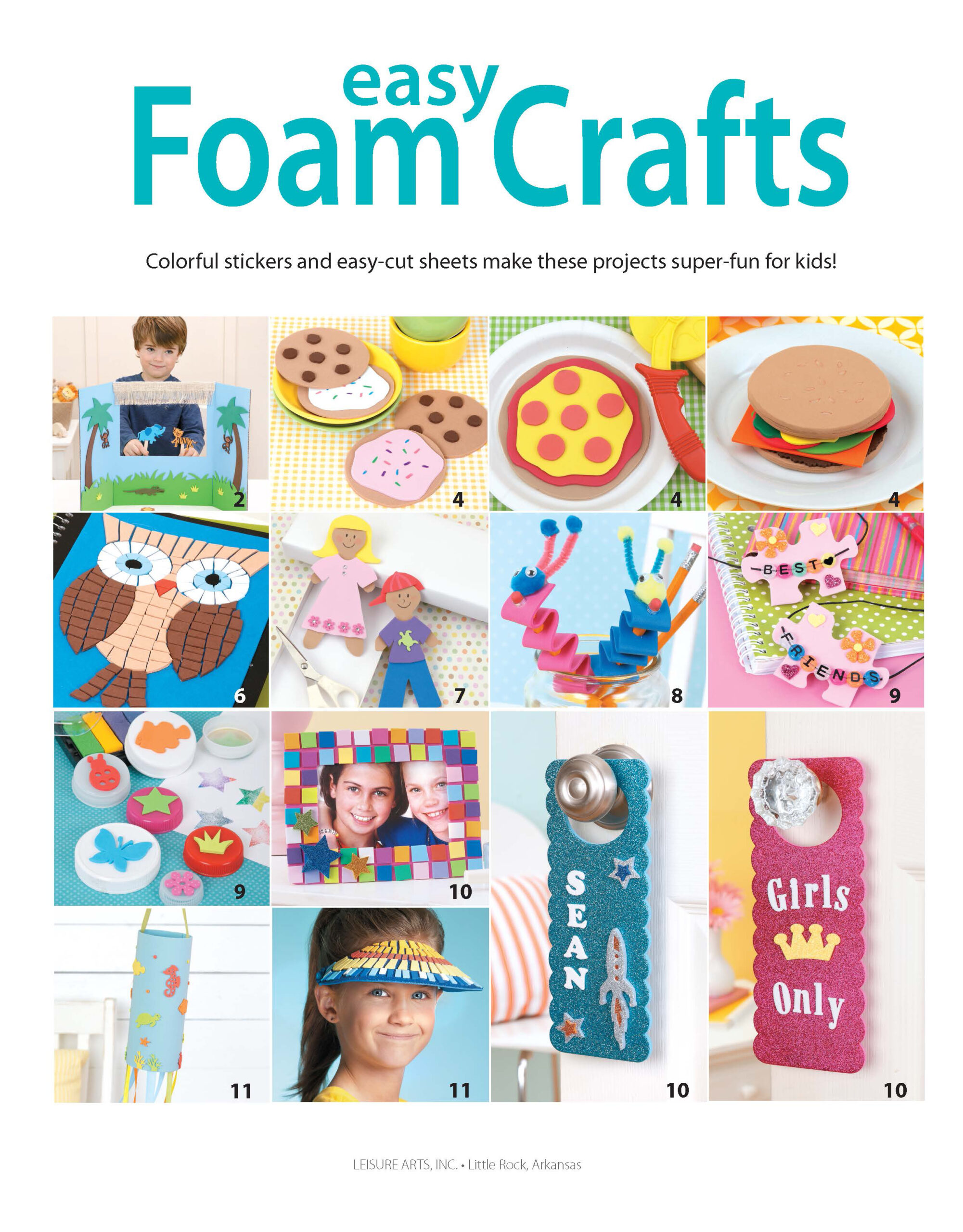 Leisure Arts Easy Foam Crafts eBook- Colorful stickers and easy-cut sheets make these foam crafts super-fun for kids. Make your own toys, accessories and décor with templates and easy-to-follow instructions. 14 easy projects include: puppet theater, play food, owl journal, dolls, inch worm pencils, best friends puzzle necklaces and more. Projects call for craft foam, stickers, beads, cord, tracing paper, scissors, glue and more. A great craft book for kids or beginners. 18 pages, PDF download.