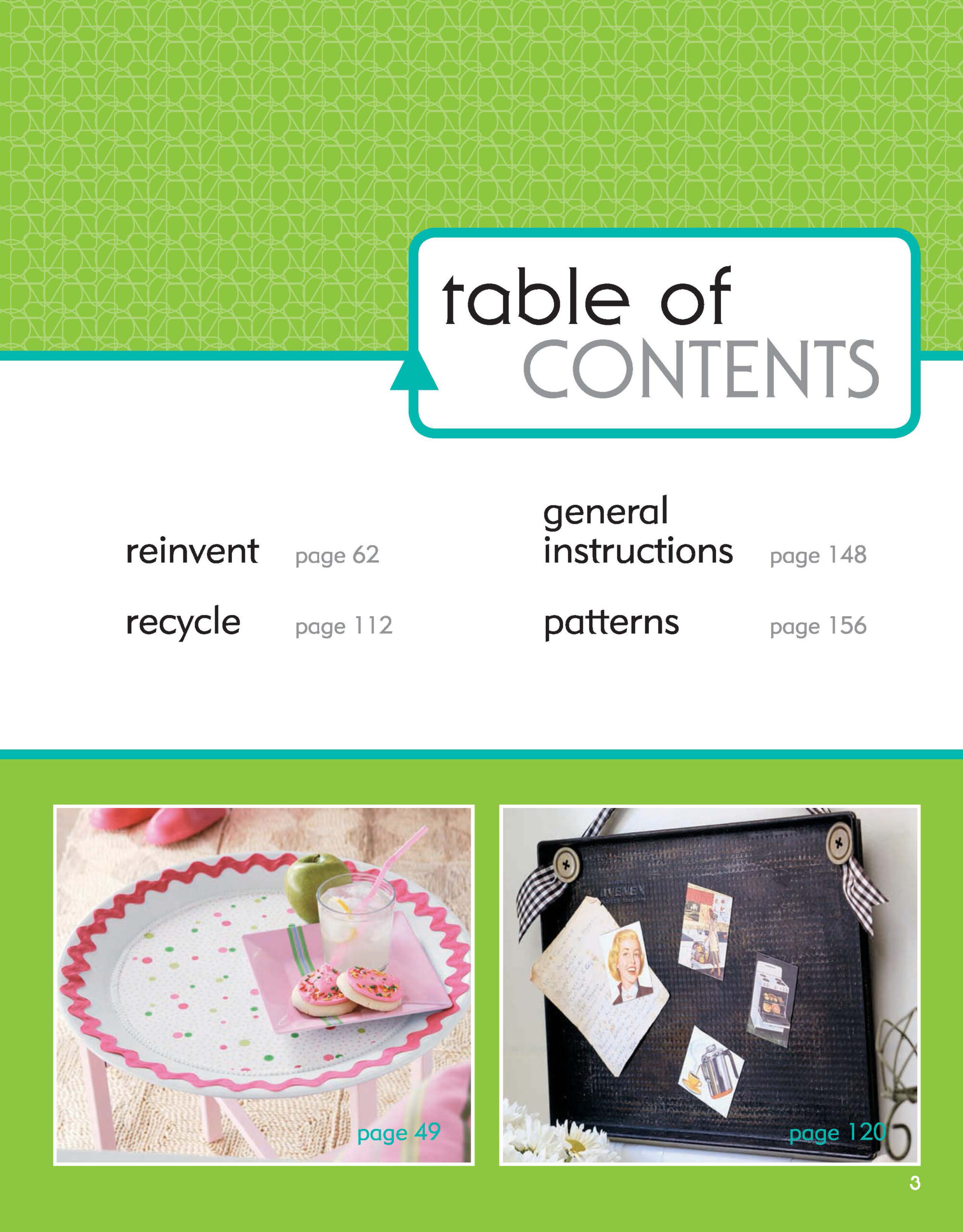 Leisure Arts Eco-Chic Decorating Craft eBook- Over 100 ideas for new-again furniture and accessories. Anyone who can apply tape, use a glue gun, or sew on a button has enough craft knowledge to rescue a huge variety of items that would otherwise be headed for the landfill. Get inspired to renew, reinvent and recycle old home decor, furniture and more. Each full color inspiration photo includes a short blurb describing the process of revamping that project. 162 pages, PDF download.