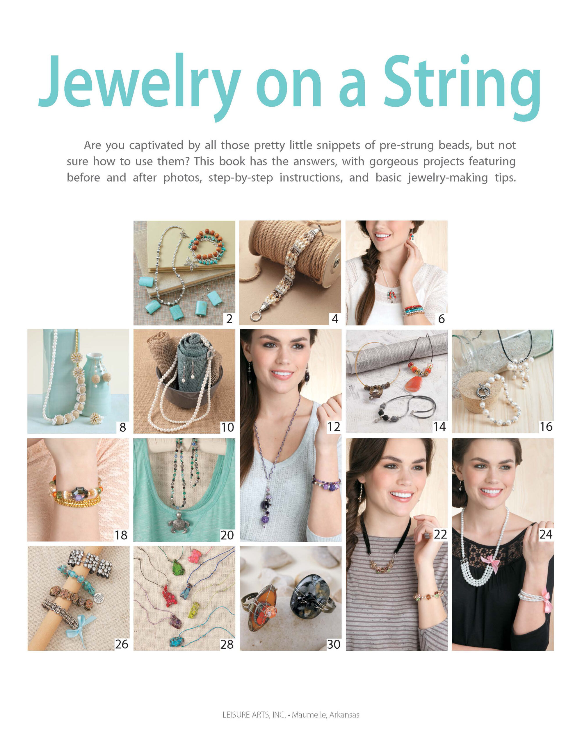 Leisure Arts Jewelry On A String eBook- Discover amazing ways to use pre-strung beads in your own jewelry crafts. From strung pearls to precious stones, pre-string beads are a craft store staple that can help you make beautiful unique jewelry for yourself or your loved ones. Re-create these 13 easy designs with basic jewelry making techniques and findings, or get inspiration for your own creations. Designs include: turquoise necklace, bracelet and earrings, knotted pearl bracelet, 5-strand bracelet, necklace and earrings, burlap and lace necklace, purple necklace, and many more. Includes shopping lists, step-by-step instructions and photo inspiration for each design, plus a brief guide on jewelry making basics. Finished designs can be easily adjusted to fit anyone. Easy skill level. 34 pages, PDF download.