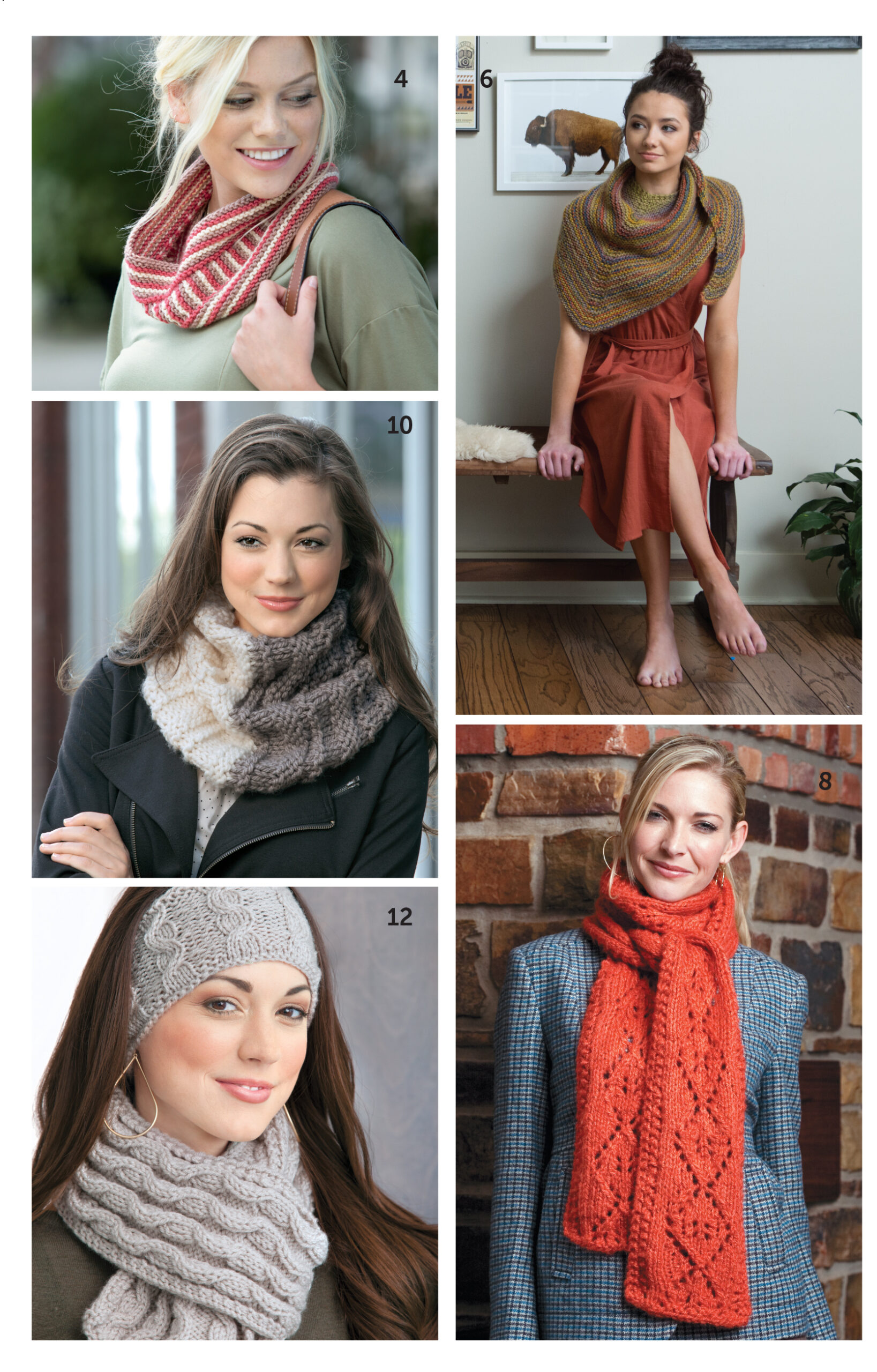 Leisure Arts Modern Scarves Knit Pattern- 5 knit scarf patterns made from a variety of yarn weights. A great pattern sampler for stash busting. Designs include: striped cowl, triangle shawl, quick scarf, rigid cowl and cable set. Projects call for yarn in sizes 3 light , 4 worsted, 5 bulky or 6 super bulky and a combination of circular and straight knitting needles in US sizes ranging from 8 to 15. Includes step-by-step instructions for each design and a brief guide to knitting with illustrated stitch diagrams. Finished scarves measure between approximately 17″x 21″ and 7″x 81″. Easy skill level. 17 page, softcover, pocket sized booklet.