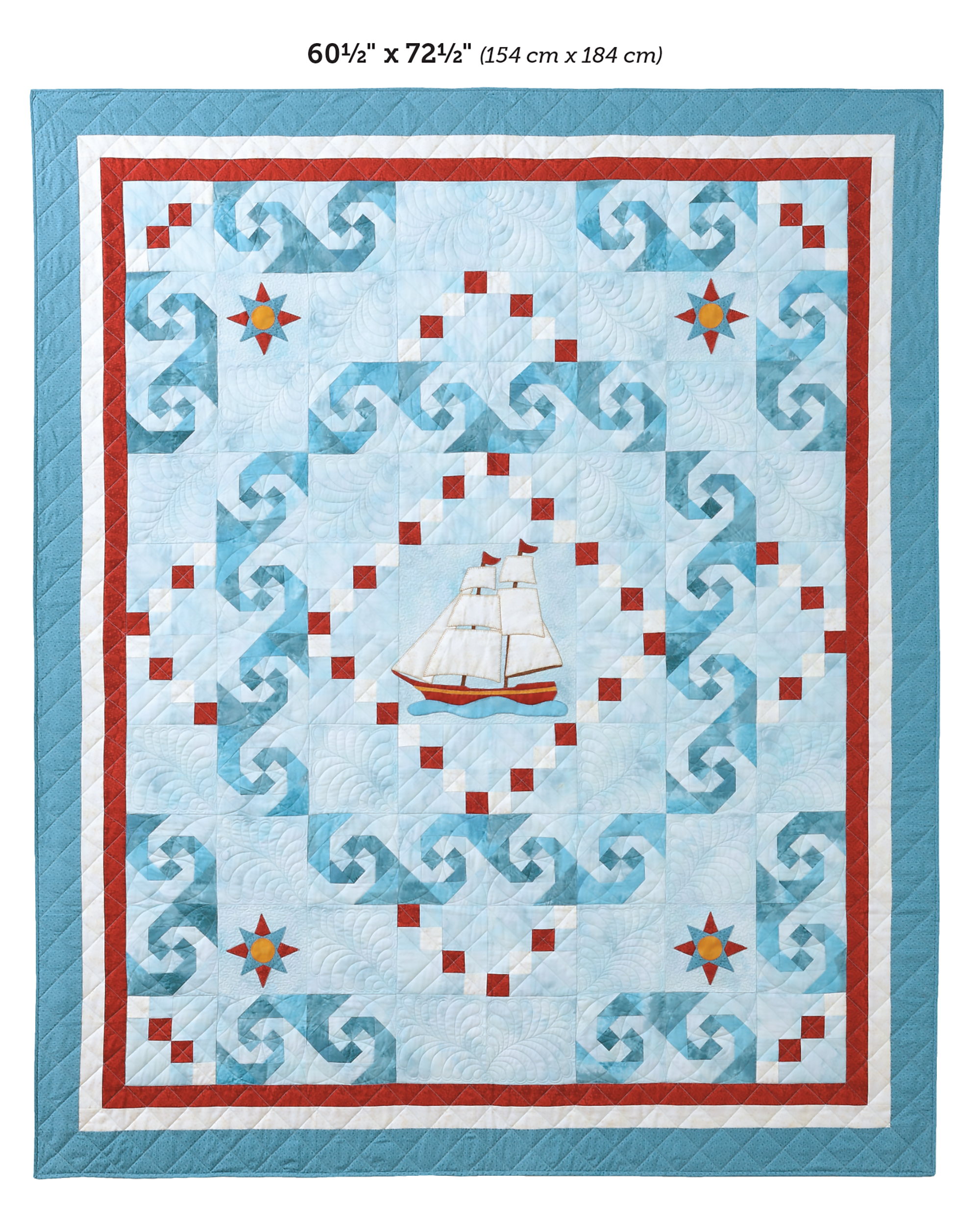 Leisure Arts Sea Journey Quilt Pattern- Use applique to bring this sea adventure to life. Design features 3 quilt block motifs made from arrangements of simple cut squares with a large ship shaped applique in the center. Includes step-by-step design instructions and a general guide to quilting that covers accurate cutting, easy machine quilting, binding, and much more. Full-sized patterns are provided on the enclosed pattern sheets. Finished quilt measures approximately 60 1/2″x 72 1/2″ with 6″x 6″ blocks. 24 page, softcover, pocket sized booklet.