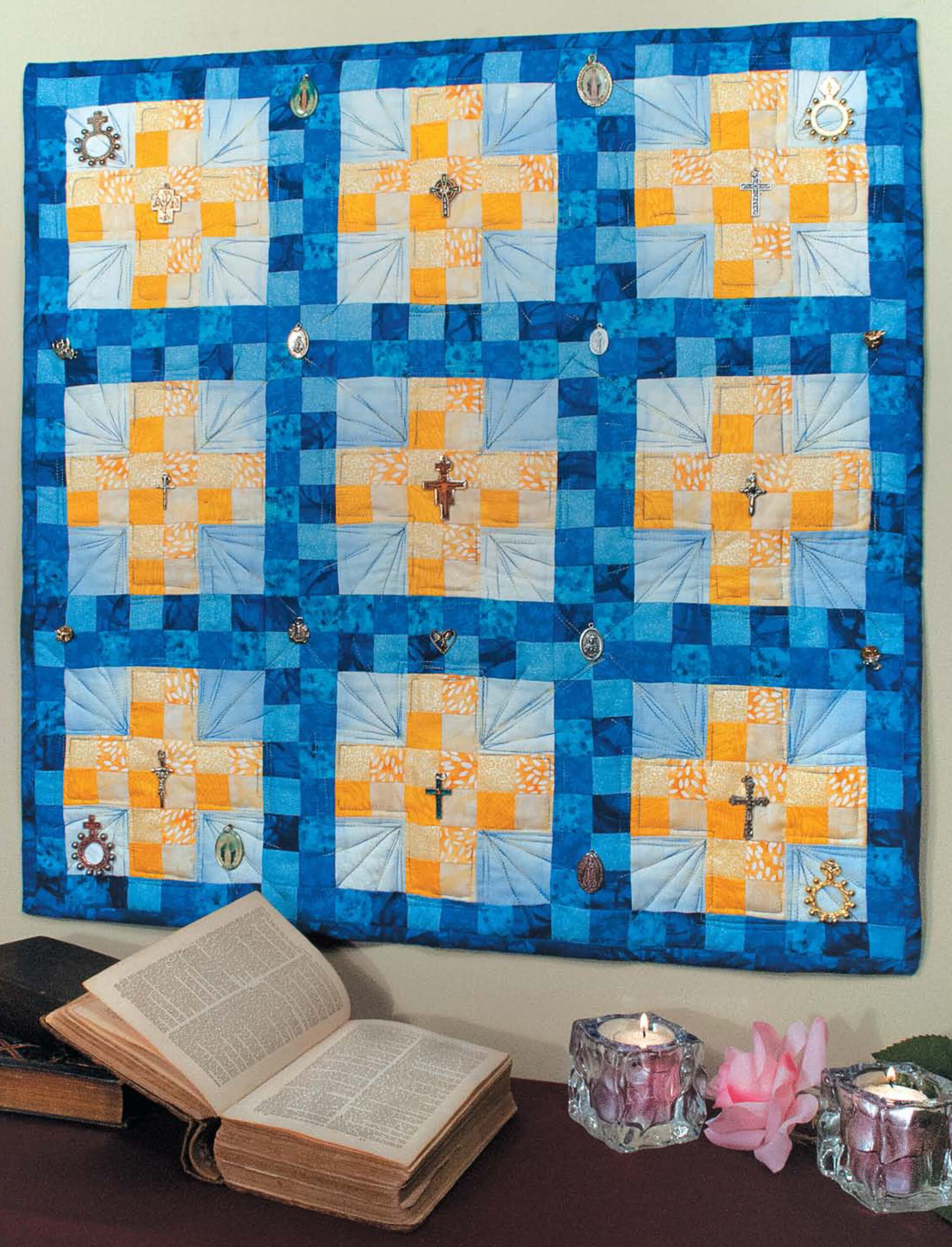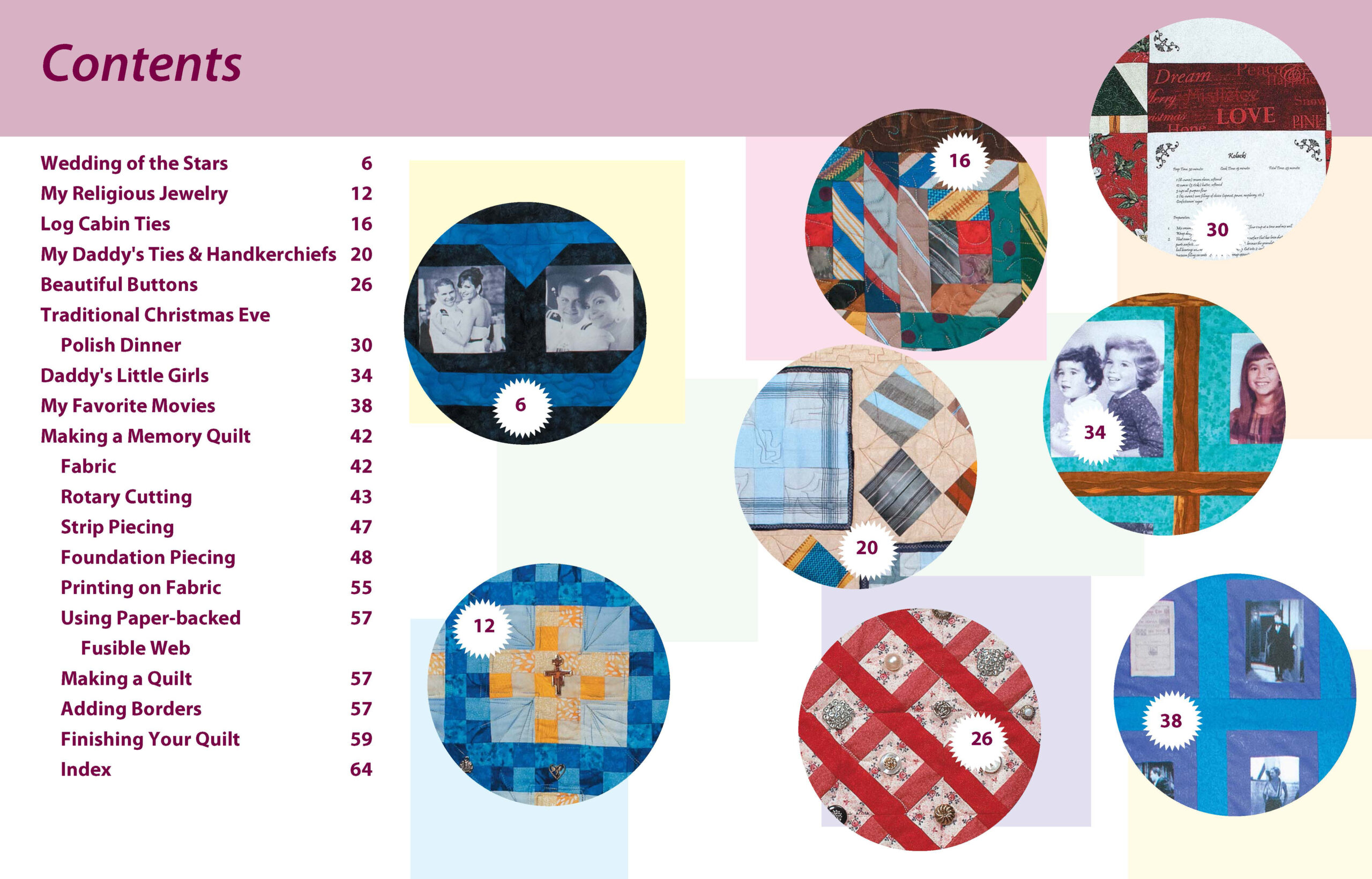 Memory Quilts- What can you do with all the bits and pieces you have collected in your life, such as your dad’s old ties, photos from your childhood, special wedding portraits, or your grandmother’s hankies? You can hide them in a scrapbook, or you can make memory quilts to keep you warm at night or to hang on the wall to see every day. Learn to transfer photos to fabric and how to place other memorabilia on quilts. Step-by-step instructions for 8 sample quilts are provided. Designs include: wedding of the stars, log cabin ties, beautiful buttons, my favorite movies, and more. Finished designs measure between approximately 24″x 32″ and 68″x 88″. Some designs are fat quarter friendly. Easy skill level. 64 pages, softcover.