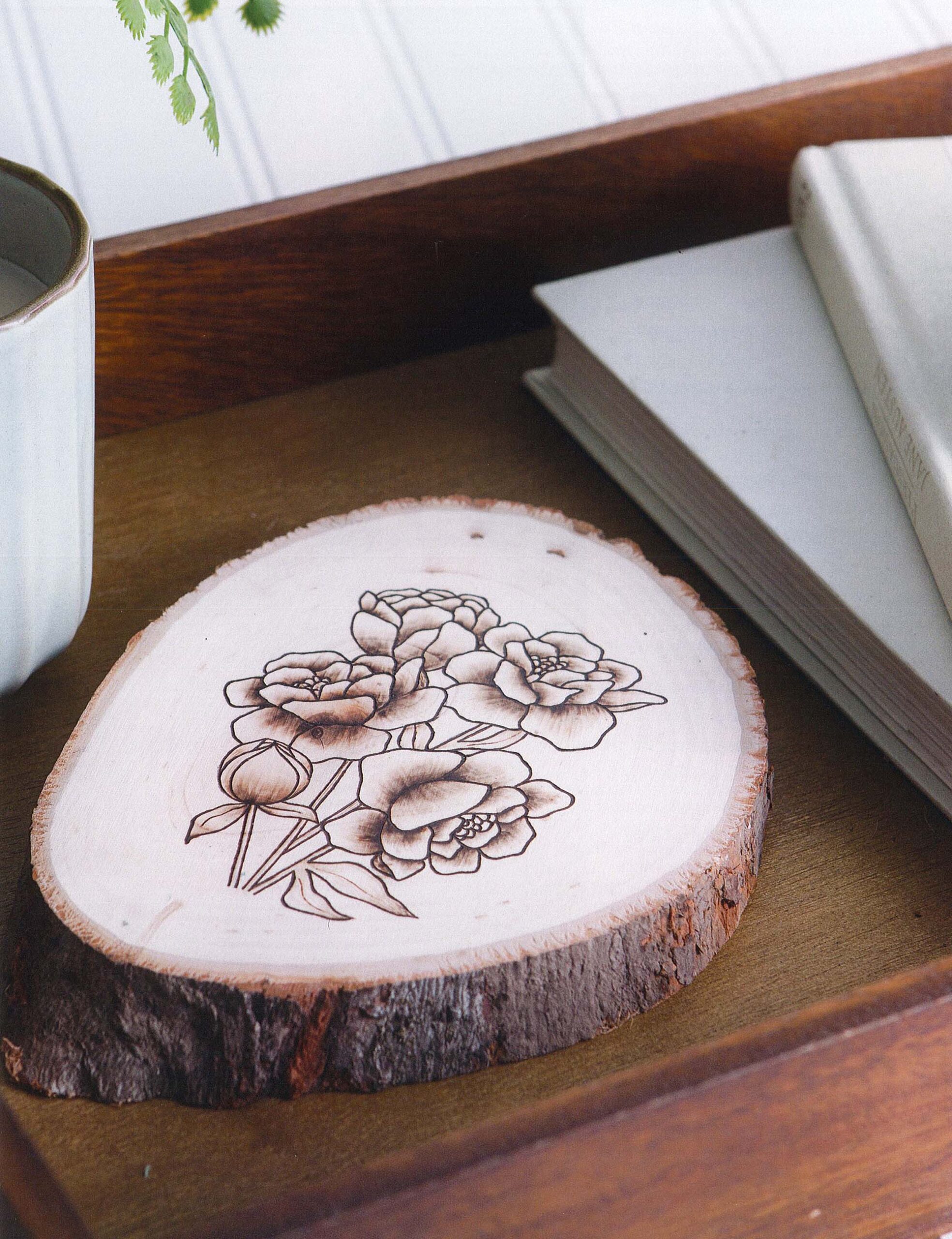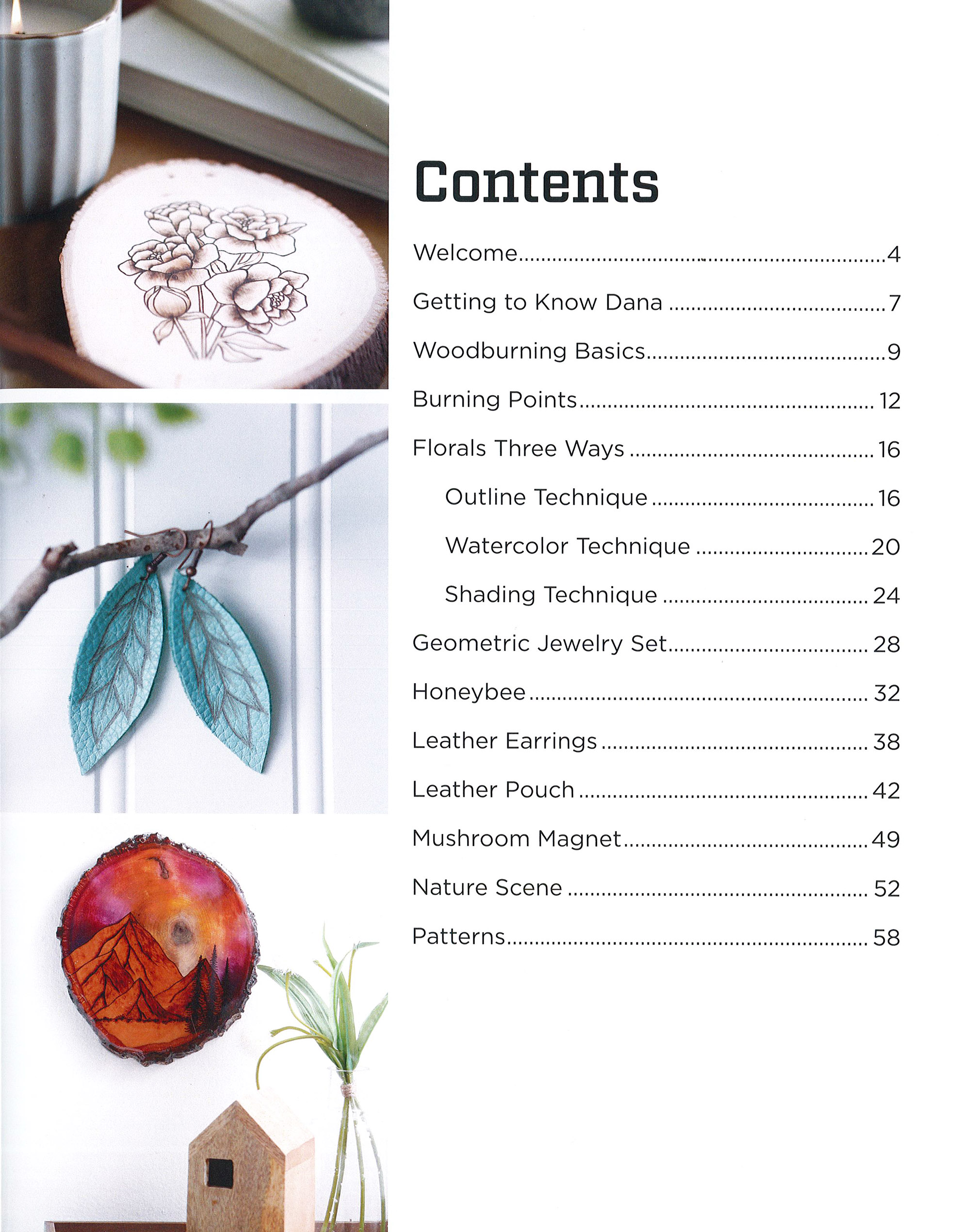 Modern Woodburning ll- Pyrography is the process of decorating wood or other materials by using heat to burn a design onto them. From simple designs to adding other media, you’ll be walked through basic linework, lettering, shading, fine details, and more with step-by-step instructions and photos. Use these beginner level burning techniques on plaques, magnets, and jewelry on both wood and leather. Full size patterns are also included to help you on your burning journey. The 10 mixed-media pyrography projects include: florals three ways, geometric jewelry set, leather earrings, nature scene, and more. Materials needed for projects include a wire tip woodburning tool, unfinished wood and the right wire tip for your project. Be sure to follow proper safety precautions while wood burning. 64 pages, soft cover.
