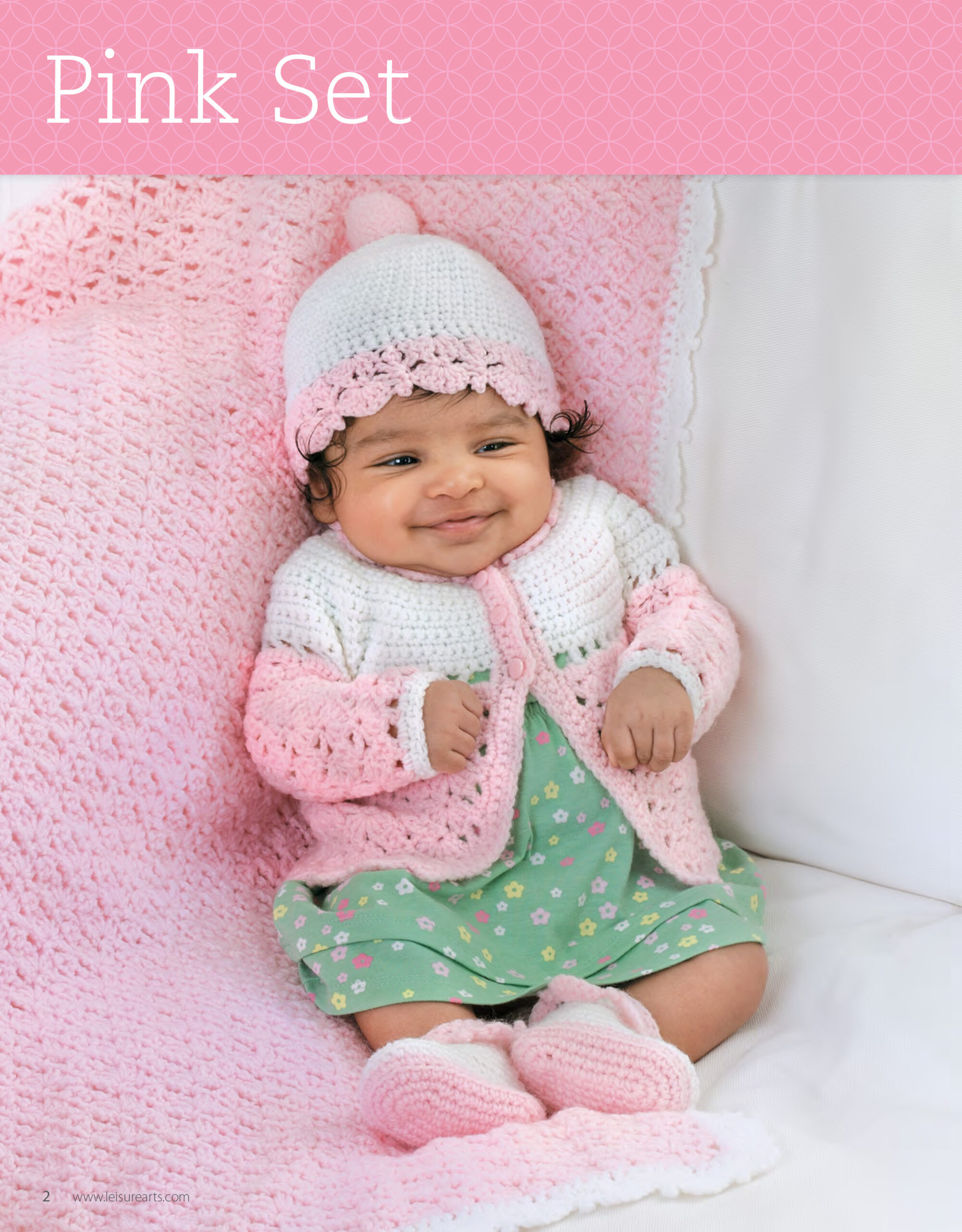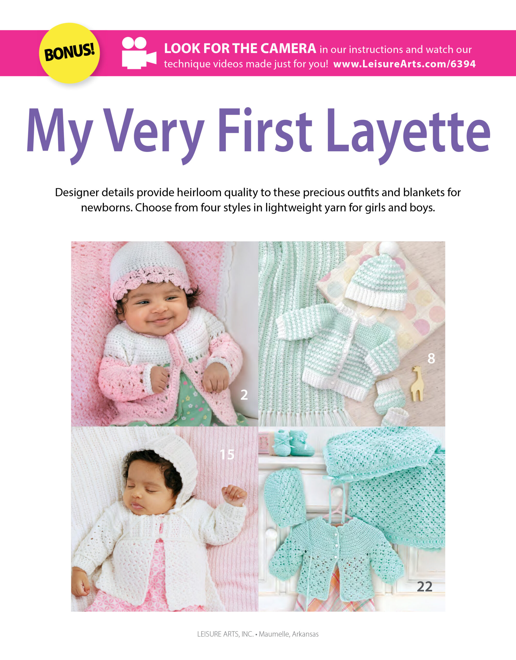 My Very First Layettes- Wrap up the little one with these 4 layette sets to crochet in soft pastels or bold colors. Easy-to-stitch, these sets will look adorable on babies from ages newborn to 3 months. Each sets includes: sacque, hat, booties and afghan. Projects can be made using size 3 light weight yarn and a size F-5, 3.75 millimeter, crochet hook. Includes step-by-step instructions and illustrated diagrams. Easy skill level. 32 pages, soft cover.