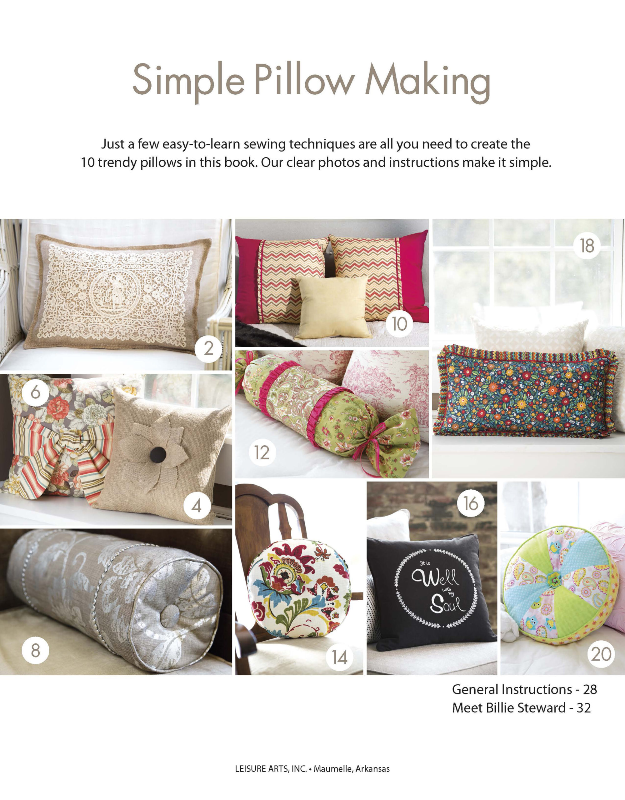 Simple Pillow Making- Just a few easy-to-learn sewing techniques are all that is needed to create 10 trendy pillows. Make classic pillows, bolsters and accent pillows with ruffles, welting and other trims. Includes burlap flange, burlap flower, tied sash, welted bolster, European, ruffled, box-edge, and many more pillows. Color photos and clear instructions. 32 pages in a softcover.
