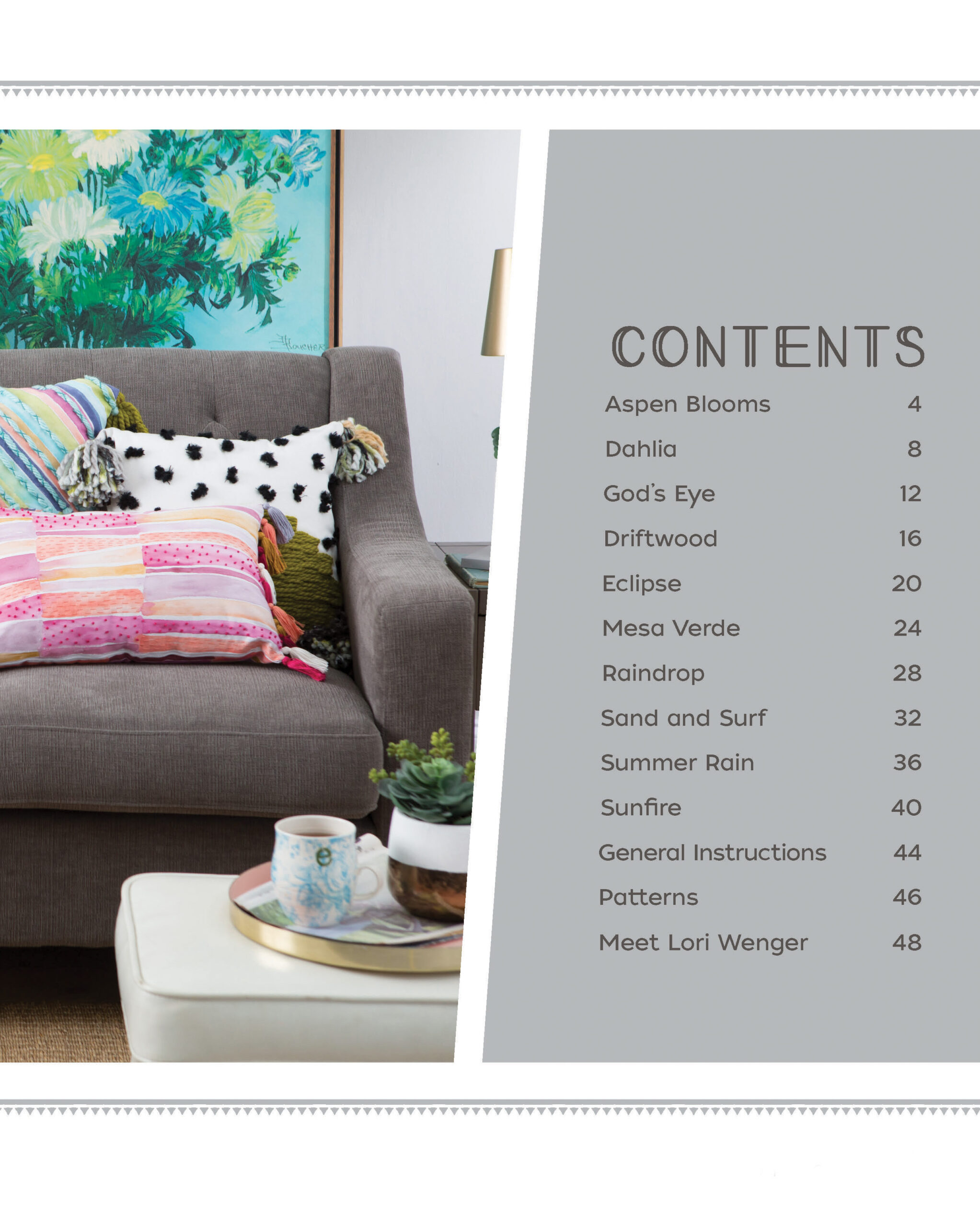 Textured Pillows- Turn your home into a bohemian oasis with these DIY textured pillows. Make them your own with different paints, yarns, and color palettes. Projects include: aspen blooms, eclipse, summer rain, dahlia, God’s eye and more. Includes instructions, patterns, and all the information you’ll need to create your own decorative pillows. Each start with a solid, light colored pillow cover with zipper and can be constructed using simple hand sewing and hot glue. Pillow sizes measure between approximately 16″x 16″ and 20″x 20″. Beginner skill level. 48 pages in a softcover.