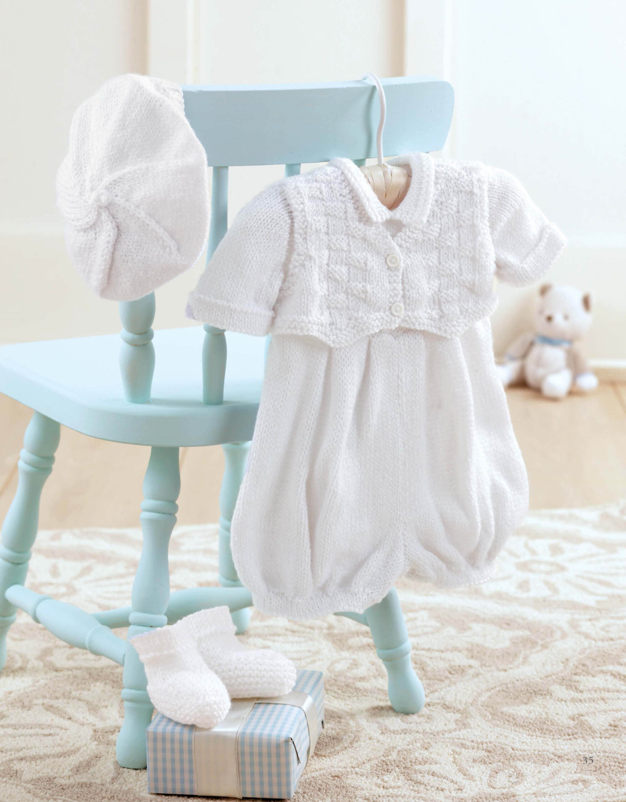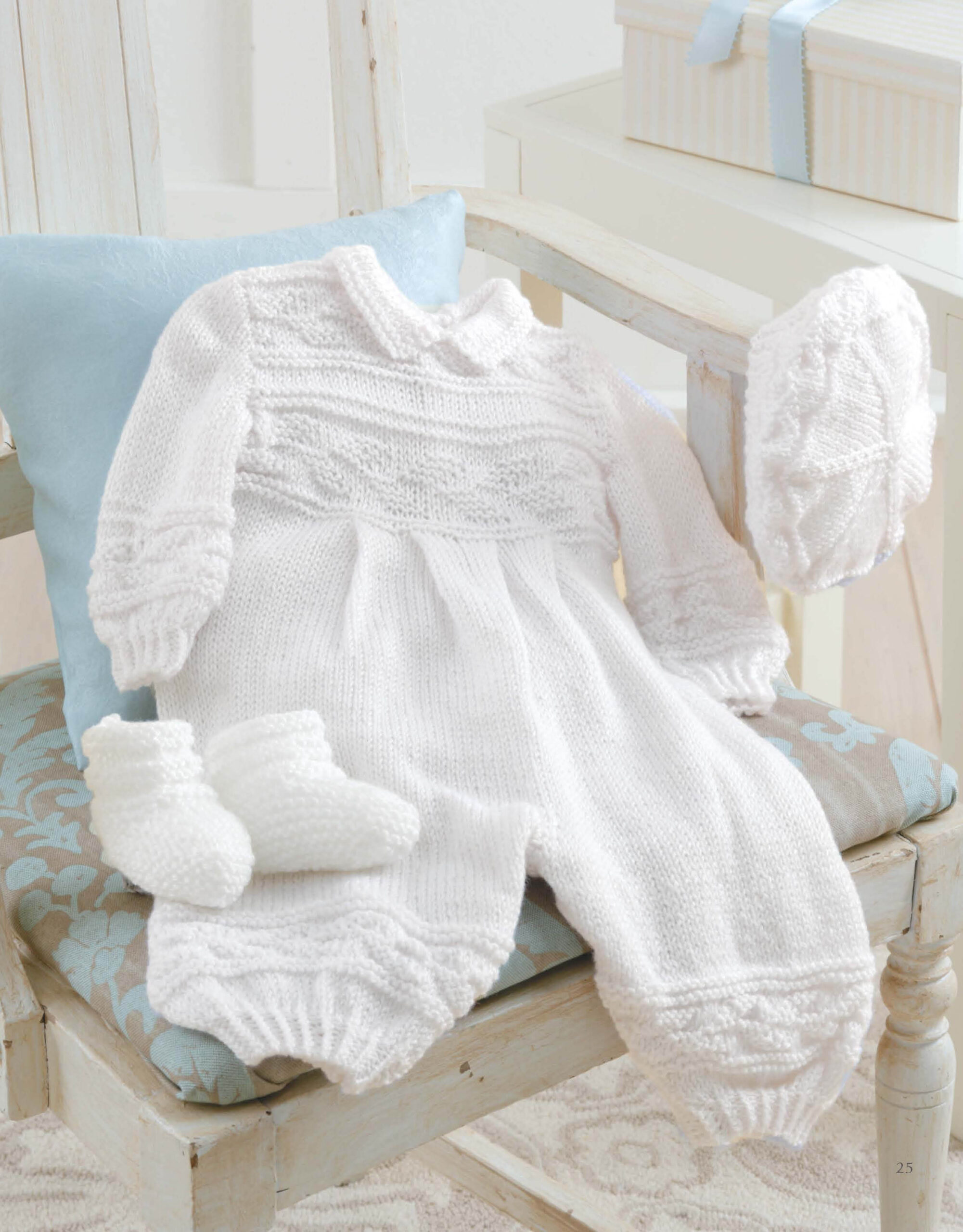 Timeless Christening Sets- Adorable romper & gown sets for baby boys & girls. Designs include: sweet snowflakes, sugar and spice, bouncing boy, and best vest boy. Each includes a gown, bonnet, and booties. When wearing these adorable designs, that special baby will be picture perfect on the big day. Projects call for size 3 light weight yarn and a combination of straight in circular knitting needles in US sizes 6 and 7. Included instructions create one size: newborn to 3 months. Intermediate skill level. 40 pages in a softcover.